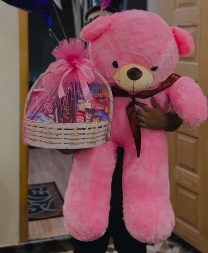 🎀 Large pink teddy bear with a ribbon around the neck