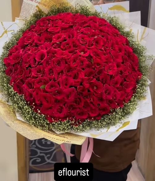 🌹 A massive round arrangement of red roses — tightly packed to form a large, full dome shape